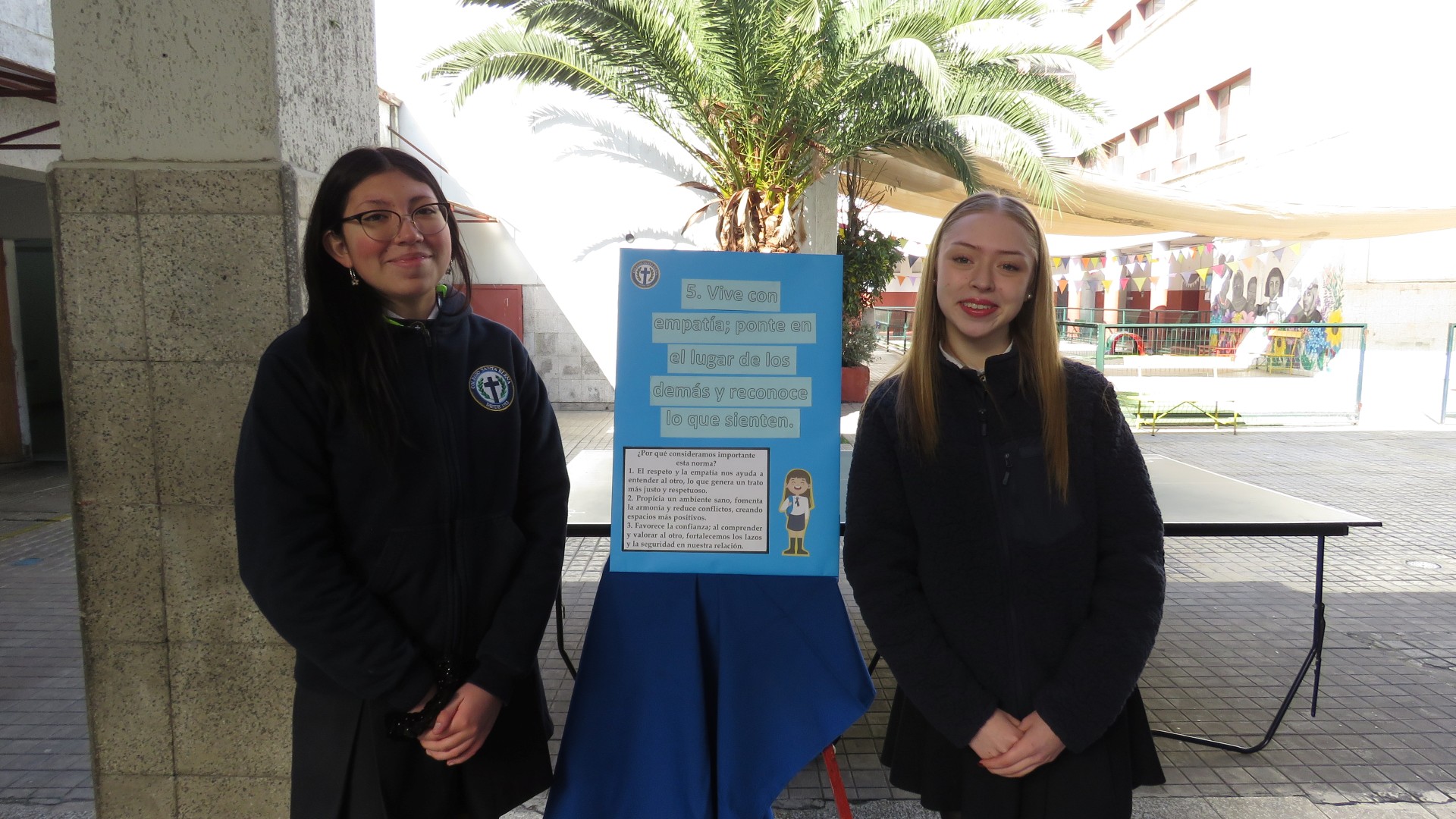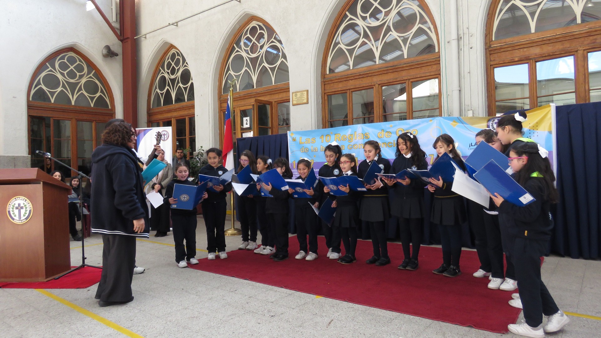 Durante la jornada, estudiantes, apoderados y autoridades recorrieron la exposición de las “10 Reglas de Oro”, instalada en el patio del colegio. Luego, se vivió un emotivo acto donde se agradeció el esfuerzo de toda la comunidad escolar, especialmente a nuestras estudiantes líderes, cuyo compromiso y creatividad han sido clave para hacer realidad esta propuesta.