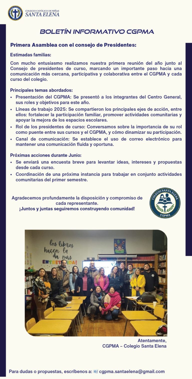 Querida Comunidad: Nos presentamos como el Centro de Padres, Madres y Apoderados del Colegio Santa Elena, un grupo de apoderados y apoderadas comprometidas en aportar activamente al desarrollo integral de nuestras niñas y al fortalecimiento de la vida escolar.Nuestro rol es ser un puente de comunicación y colaboración entre las familias y el colegio,promoviendo siempre el diálogo, la participación y el trabajo conjunto. Aspiramos a contribuir en la construcción de una comunidad educativa más cercana, respetuosa y participativa,donde todos y todas.
